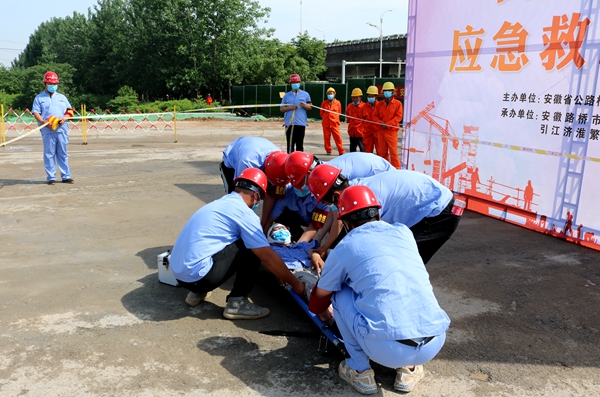 5月29日,公司在引江濟(jì)淮繁華大道項(xiàng)目舉行高處墜落事故應(yīng)急演練。公司領(lǐng)導(dǎo)班子及機(jī)關(guān)各部門(mén)負(fù)責(zé)人、分子公司領(lǐng)導(dǎo)班子成員、各項(xiàng)目經(jīng)理、繁華大道項(xiàng)目全體員工及工友代表參觀演練。